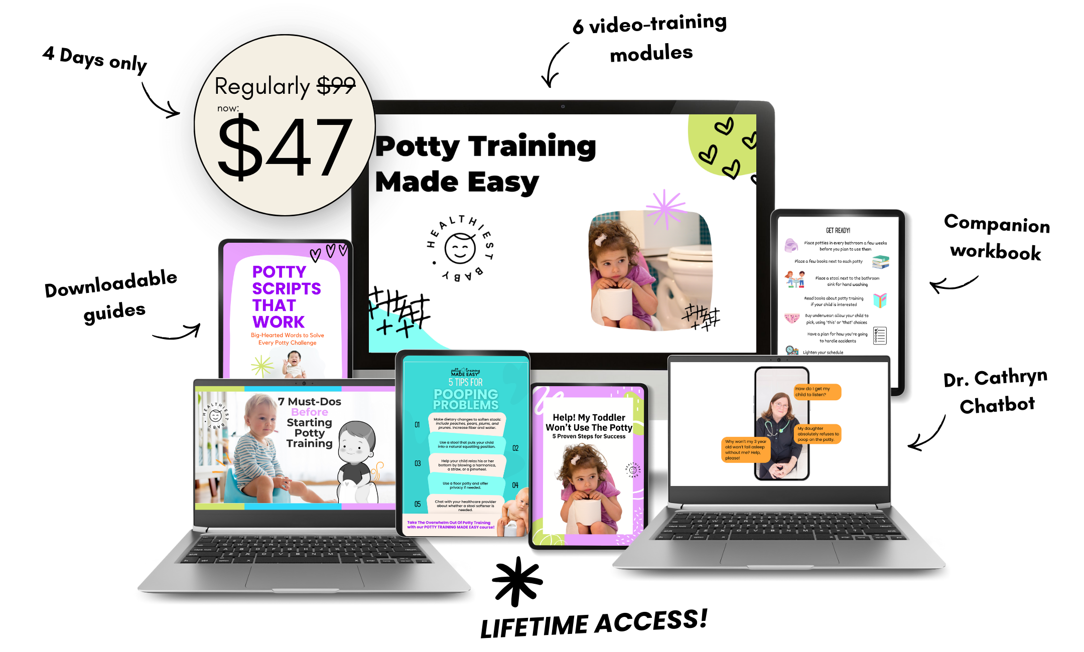 6 Bite-sized modules (each video is 5 minutes or less) designed for busy parents where I’ll walk you step by step through the potty-training process.